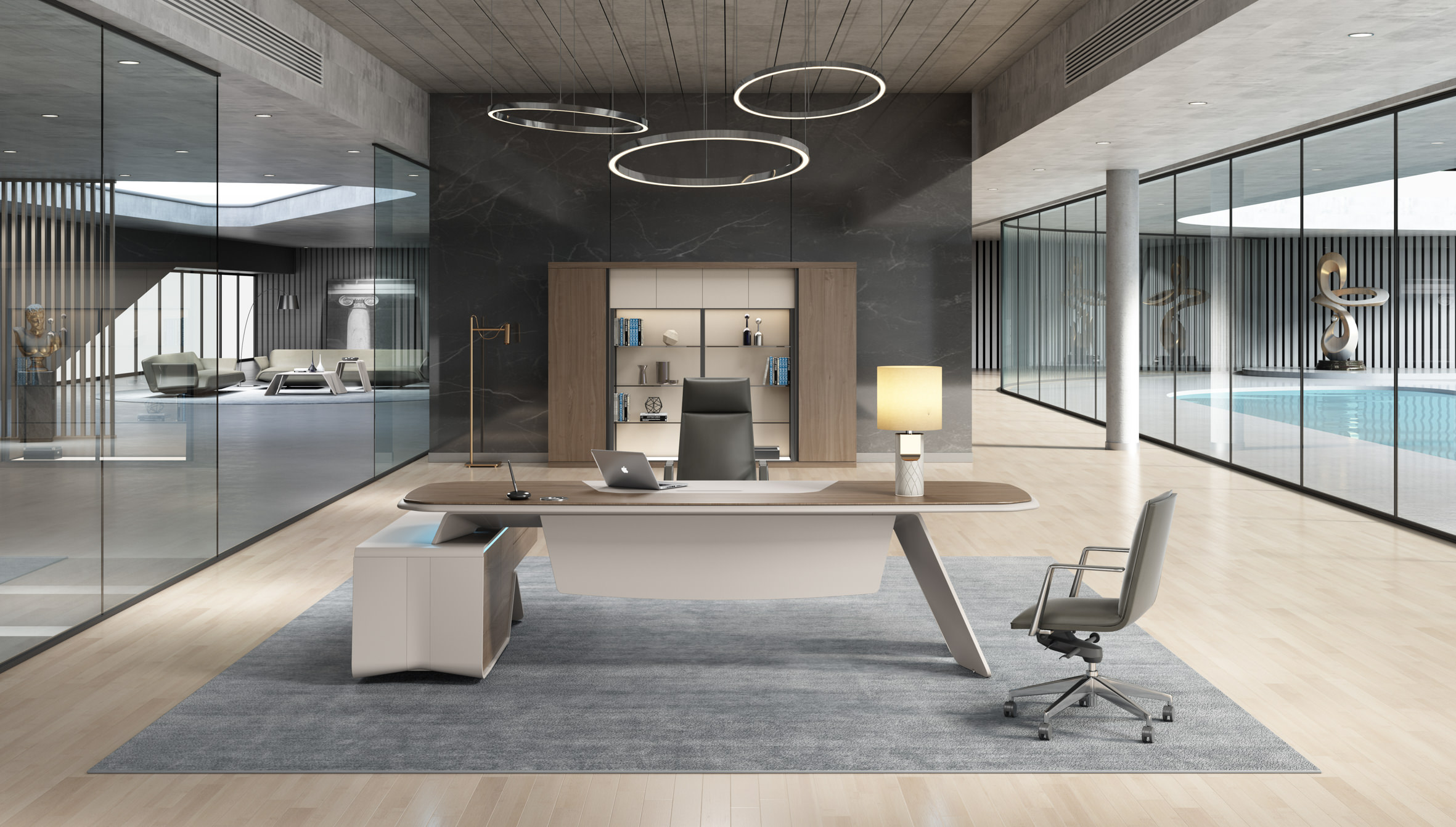 Inspired by contemporary architecture and the harmony of classical proportions, this collection combines natural wood, matte lacquers, and sculptural geometries to create environments that convey authority without rigidity—power without ostentation.
